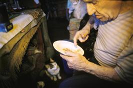 RUSSIA. Birobidzhan, The Jewish Autonomous Region. 1999. The first Jewish homeland of modern time, created 20 years before Israel, located in Far-East Siberia. Years of economic decline hit Birobidzhan hard, leaving pensioners without pay for months. Grandfather Yasha picks the day's last crumb.