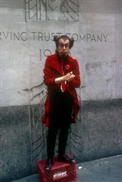 USA. Wall St. NYC. 1979. Street entertainer, self admitted "worlds worst magician." in front of Irving Trust Company.
