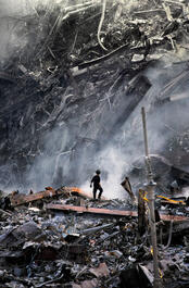 USA. New York City. September 11, 2001. Rescue workers search a mountain of wreckage after the collapse of the World Trade Center's Twin Towers.