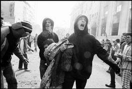EGYPT. Cairo. February 3, 2012. Protestors carry an injured...