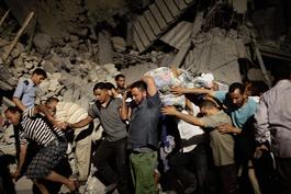 LIBYA. Tripoli. Sunday, June 18, 2011. Neighbors carry the body of a dead man from the rubble of a three story house in Tripoli that had been destroyed by an alleged NATO airstrike early Sunday. At least two people had been killed.