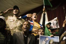 LIBYA. Tripoli. March 10, 2011. Supporters of Muammar Qaddafi sing the Libyan national anthem during a meeting with Colonel Qaddafi's son Seif al-Islam in a tent-like hall near the Rixos al-Nasr Hotel in.