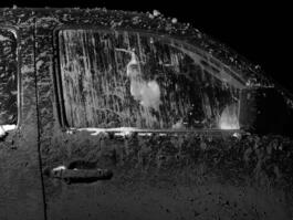USA. Williston, ND. 2012. Dog inside dirty truck. Outside Hampton...