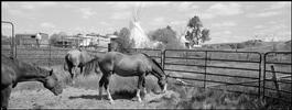 USA. Crow Indian Reservation, Montana. August, 2012. Coralled horses. The Crow Indian Reservation (Tipi Capital of the World) boasts 1500 tipis during its annual powwow where residents erect and move into canvas tipis for the week participating in rodeo and powwow events.