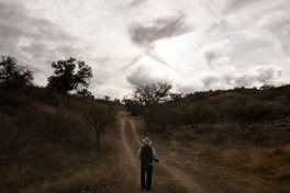 USA. Arizona. 2012. Jim Chilton walks down a road on his land. He carries a six-shooter and two rifles in his car when traveling through his land. His 50,000 square acre ranch has 2000 heads of cattle. Thousands of illegal Mexican immigrants and drug smugglers pass through his land every year. A small barb wire fence is all that separates his land from Mexico.