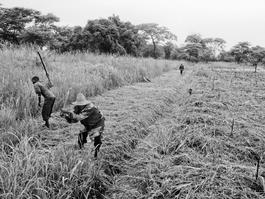 MALAWI. Salima District. February 5, 2013. Workers clear weeds from a mango tree field on the grounds of the Matumba Farms outside Salima, Malawi. Malawi Mangoes is an agricultural startup founded in 2010 by two Brittish businessmen (Craig Hardie and Jonny Jacobs) to meet the global market demand for smoothie-ready fruit. Their plan was to become the link between the languishing wild fruit of Malawi and the insatiable demands of the juice industry. With the addition of some technological tools, they'd even be able to show buyers exactly where their fruit had come from, and how it traveled to reach them.