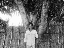 MALAWI. Salima District. February 5, 2013. Small farmer Fatuma Yasini, 29, poses in front of one of her mango trees in her home village of M'bwana, Salima District, Malawi. The mangoes growing from this tree are then sold to Malawi Mangoes. Malawi Mangoes is an agricultural startup founded in 2010 by two Brittish businessmen (Craig Hardie and Jonny Jacobs) to meet the global market demand for smoothie-ready fruit. Their plan was to become the link between the languishing wild fruit of Malawi and the insatiable demands of the juice industry. With the addition of some technological tools, they'd even be able to show buyers exactly where their fruit had come from, and how it traveled to reach them.
