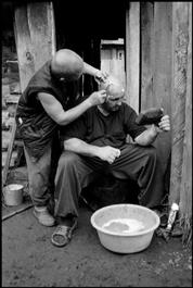 RUSSIA. 70 kilometers from Yekaterinenburg. 2010. Sergey POLOVTEV, aka "Kaban" (wild boar) getting shaved by Vasily NOBOSYELOV aka "Ded" (grandfather).