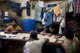 INDIA. Mumbai. 2009. Child laborers sewing sequins on sari material in Dharavi slum.