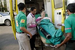 INDIA. Mumbai. 2009. Ambulance drivers of 1298, a network of low cost emergency medical care, bringing patient to hospital.