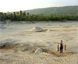 Bangladesh. 2007. Man carrying wood through a riverbank.