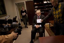 FINLAND. Helsinki. 2008. Nobel Peace Prize laureate Martti AHTISAARI being prepared for a televised speech in his office in Helsinki. (©Jonas Bendiksen/Magnum Photos for the Nobel Peace Center)