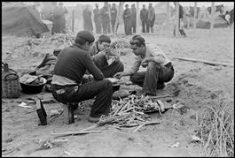FRANCE. Argeles-sur-Mer. March 1939. Three Republican soldiers eating around fire in an internment camp for Spanish refugees. (From the Mexican Suitcase)