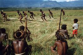 INDONESIA. Irian Jaya. August 1996. Pyramid, Baliem Valley. Dani spectators watch performances of a Dani mock war, sponsored by the Indonesian government to attract tourism.