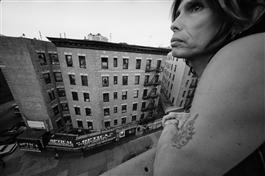 USA. New York City. 2001. Steven TYLER looking out at a view of Manhattan.