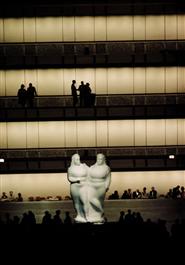 USA. New York City, 1964. Crowds gather in main lobby of Lincoln Center's New York state theatre during an intermission. The white sculpture is one of a pair by Elie Nadelman.