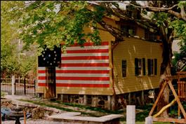 USA. Maine. Kennebunk. Clapboard (wooden) house painted with the American flag.