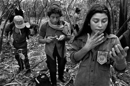 EL SALVADOR. Morazan. 1991. Young guerilla recruits from Segundo Montes rise in the morning to brush their teeth and bathe after sleeping on the forest floor. Peasants remained in strong support of the FMLN guerillas throughout the war.