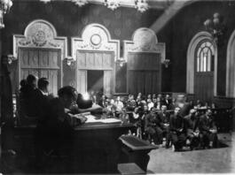 SPAIN. Law court of Barcelona. People's tribunal similar to those in place under the autonomous Government of Catalonia. The accused, seated on the bench on the right, are on trial for conspiracy against the Republic. July 1936.