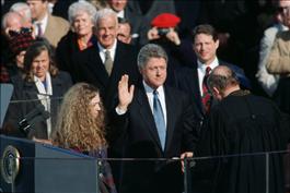 USA. Washington, D.C. 1993. William Jefferson CLINTON is sworn in as the 42nd President of the United States by Supreme Court Chief Justice William REHNQUIST. Clinton used a personal copy of the King James Bible for the ceremony.
