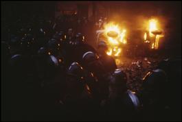 FRANCE. Paris. May 68. Riot police fight students who set fire to cars in the Latin Quarter.