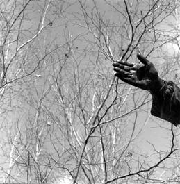 GB. London. The City, financial district. Hand of Statue with Autumn leaves.