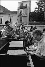 The English jazz musicians Mike WESTBROOK (piano, tuba, conductor) at the piano and his wife Kate WESTBROOK (singer, tenor saxhorn, piccolo, flute) with the French jazz musician Dominique PIFARELY (violin, composition), standing. Saturday 25th July, 1992.