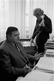 Franz Josef Strauss,the West German Minister of Defense at his desk in Bonn. A secretary is standing by the telephone in the background