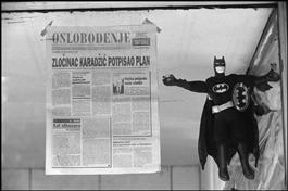 BOSNIA-HERZEGOVINA. Sarajevo. 1993. Surviving newspaper OSLOBODENJE, next to Batman.