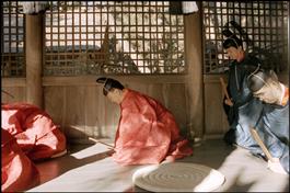 Suwa Taisha large shrine. Shinto priests thanking gods of the seasons after traditional procession through the city.