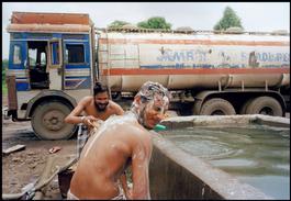 INDIA. Maharashtra. Two Sikh truck drivers bathe in a tank at...