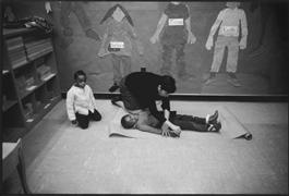 Outlines of the childrens bodies are cut out and coloured in by them. They are then hung on the wall and bodly named, this is aimed at giving the black children a sense of identity. 1968.