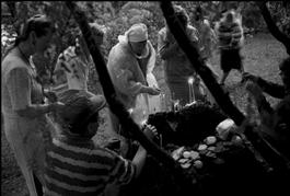 RUSSIA. Veliokoretskaya. 1998. At the end of their 120 kms walk, pilgrims of St Nicolas and tourists alike, worship trees by lighting candles, a pagan ritual within an Orthodox pilgrimage.