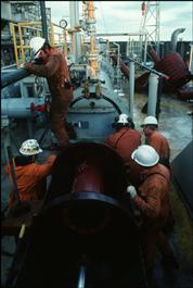 The "cleaning-pig", a nozzle shaped item diffusing compressed air, is lowered into the pipeline for cleaning the lining on the mainland.