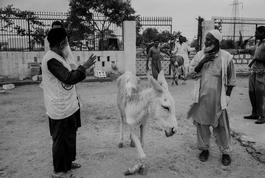 Karachi. At the Edhi animal sanctuary Edhi lets some of his mentally handicapped patients work there as a therapy. Two crippled donkeys are amongst the animals kept there. 1997.