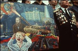 USSR. RUSSIA. Moscow. August 24th, 1991. Funeral cortege for the victims of the putsch. Picture showing a heroic scene fo the soviet occupation.