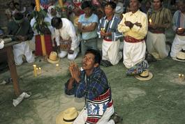 Quiché. San Andrés Sajcabajá. 1997. Men pray in a chruch on Good Friday.