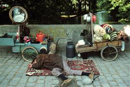 GERMANY. Bavaria. Munich. 1989. A homeless man sleeps on a carpet by a wheelbarrow in the English Garden. In front of him is a pan containing coins.