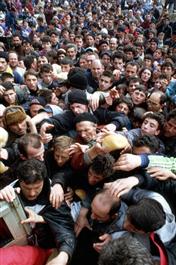 MACEDONIA. Blace, Refugees from Kosovo scramble for bread distributed by the Macedonian Red Cross.1999.