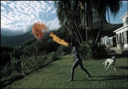 SOUTH AFRICA. Cape Town. South African artist Beezy BAILEY. Bailey's hyper expressive loosely conceptual, pink and orange and green work had some measure of success but never entered into the top echelon of South African art debate. In 1991, he submitted work to the prestigious Cape Town Triennal. One piece sent in as the work of Beezy Bailey, and three others he submitted as the work of Joyce Ntobe, a domestic worker. No one paid much attention to the Bailey work, but Ntobe was at once discovered and her work was purchased by the South African National Gallery. It is the view of Bailey and other anti liberal artists that the habit of buying black work because it is black, does more in the longrun to erode than to increase black self esteem. The white liberal community was outraged at Bailey's ploy, but many black artists applauded his courage. A White conceptual artist Beezy BAILEY, a member of one of South Africa's welathiest families in blue paint and a headdress in the backyard of his Cape Town home.