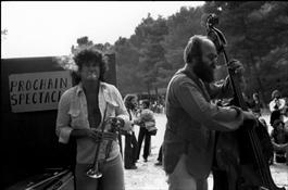 FRANCE. Provence-Alpes-Côte d'Azur region. Var department. Ollioules. Châteauvallon festival "Musique ouverte", first edition. From left to right : French jazz musicians Alain BRUNET (trumpet) and Henri TEXIER (double bass). Concert. "Petit Concert" FESTIVAL OFF. Saturday, August 21st 1976.