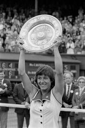 GB. London. Wimbledon Lawn Tennis Championships. Martina Navratilova won her first Grand Slam, of 18 and a record nine Wimbledon titles, by defeating her rival Evert in the final. 1977.