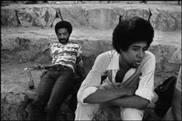 FRANCE. Provence-Alpes-Côtes d'Azur region. Var departement. Ollioules. Châteauvallon Festival. Big amphitheater. From left to right : US jazz musicians Tony WILLIAMS (drums) and Stanley CLARKE (double bass), in the seats of the amphiseater before rehearsal and soundcheck. JEAN-LUC PONTY'S LIFETIME EXPERIENCE. Monday, August 21st 1972.