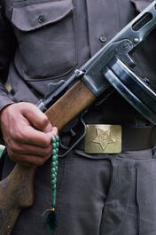 AFGHANISTAN. Kabul. 1986. Soldier holding Islamic prayer bead and Russian made gun.