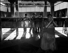 CHINA. 1998. Tibet. Lhasa. Buddhist monk praying inside the Jokhang (Buddhist sanctuary).