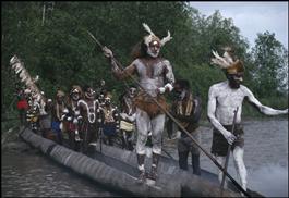 Amanamkai, in the Casuarina Coast. Asmat men in festive costume celebrate the launching of a new canoe.