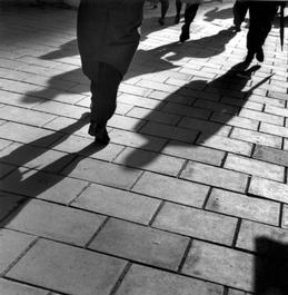 GB. London. The City, financial district. Bodies with long shadows walking on pavement.