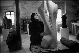 IRAN. Karaj. 1997. Sculptor Fatemeh OMIDIAN finishes a wooden...