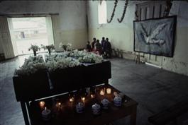 Morelia. The widows pray over the three caskets with the bones before the funeral begins.