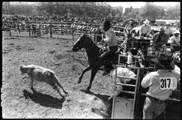 U.S.A. New York. Harlem. 1985. Rodeo. Roping a calf at a black rodeo in Harlem.
